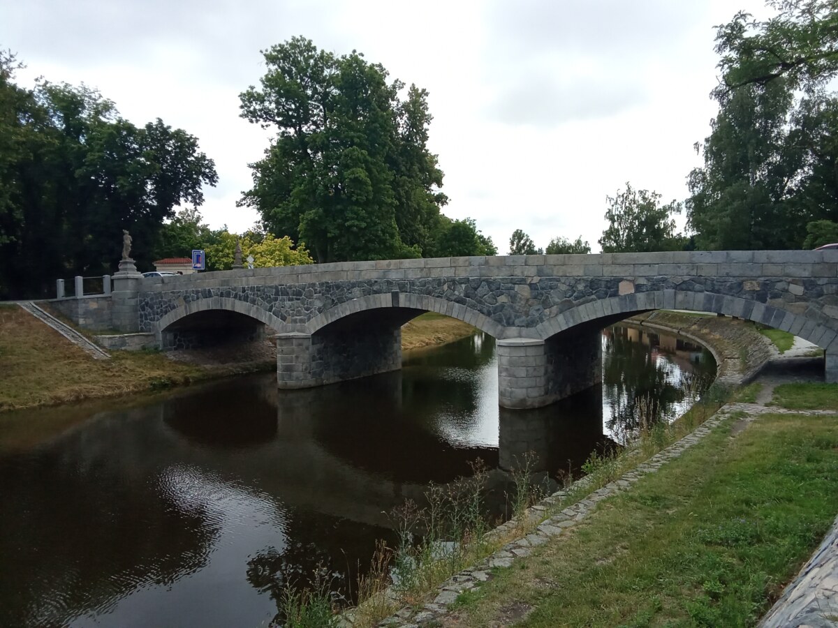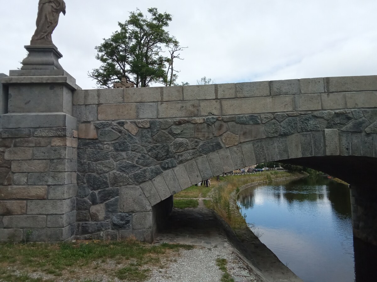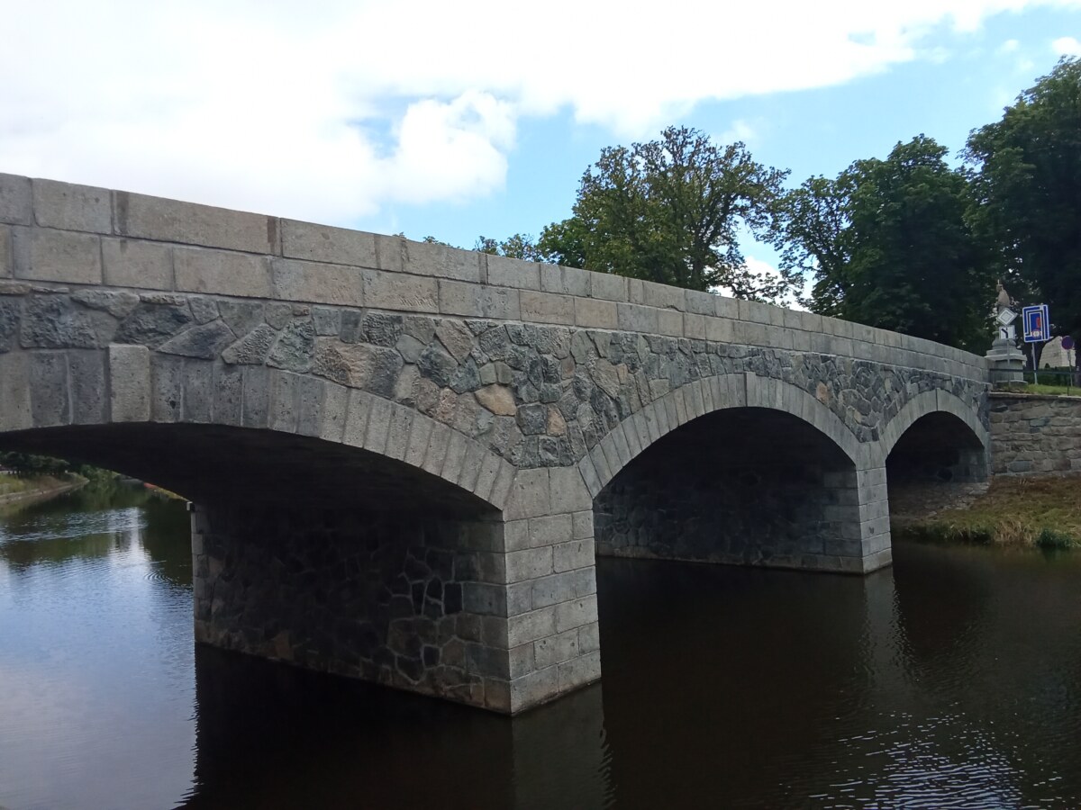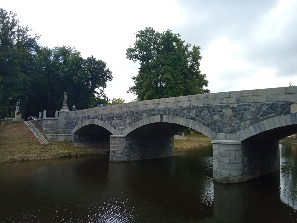 Nový kamenný most byl postaven na místo starého v roce 1899. Z původního mostu byly přeneseny čtyři sochy – tři barokní z dílny Ignáce Hammera z Dobré Vody: socha Panny Marie je z roku 1748, další dvě – sv. Dismas a Ukřižování z roku 1750. Socha sv. Jana Nepomuckého je z roku 1812. Všechny nesou ale letopočet 1901, kdy byly restaurovány. Březnický most patří mezi poslední kamenné mosty v Čechách, po té se užívalo železobetonu a je dílem rodáka Ing. J. Kodla.
