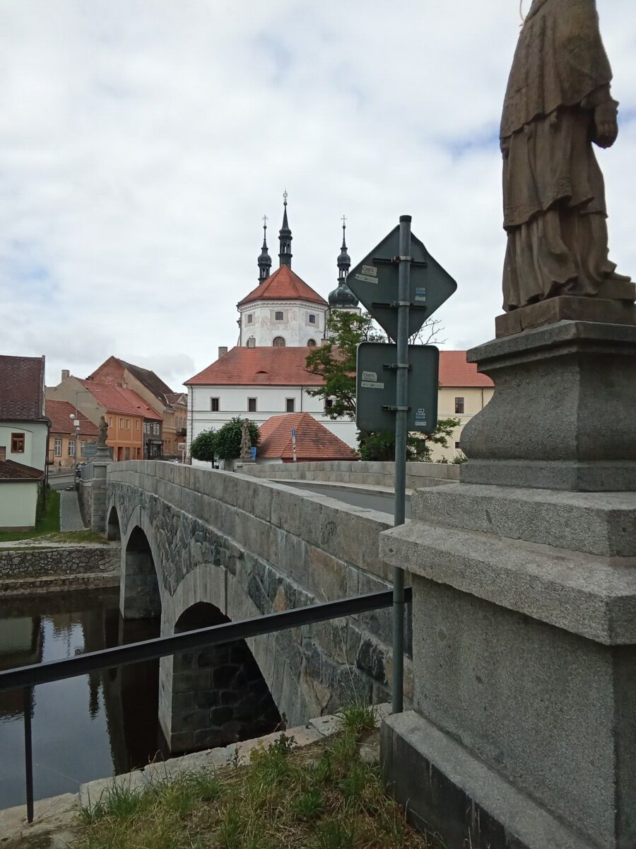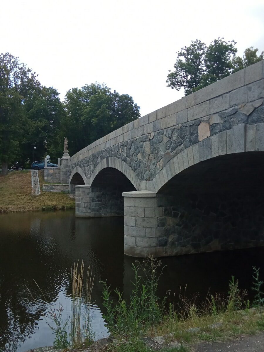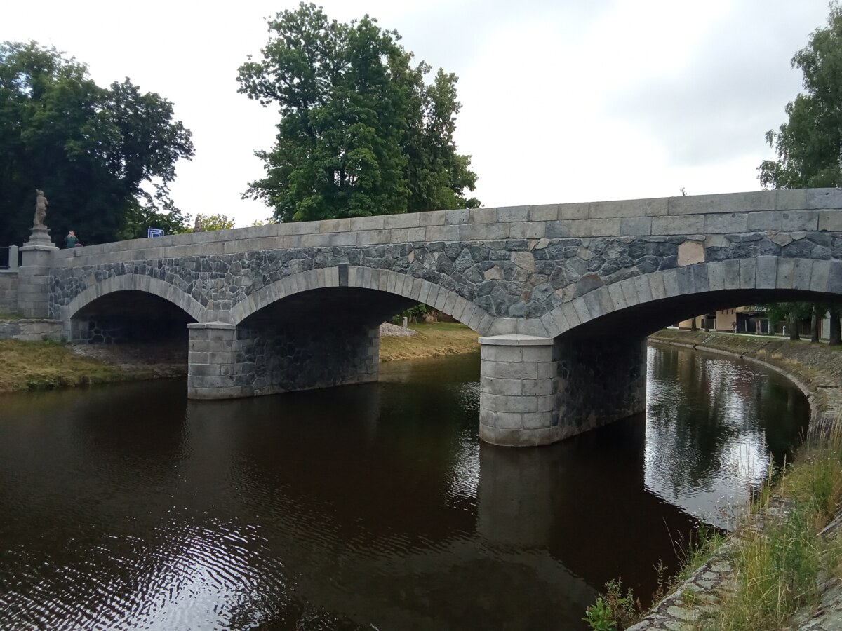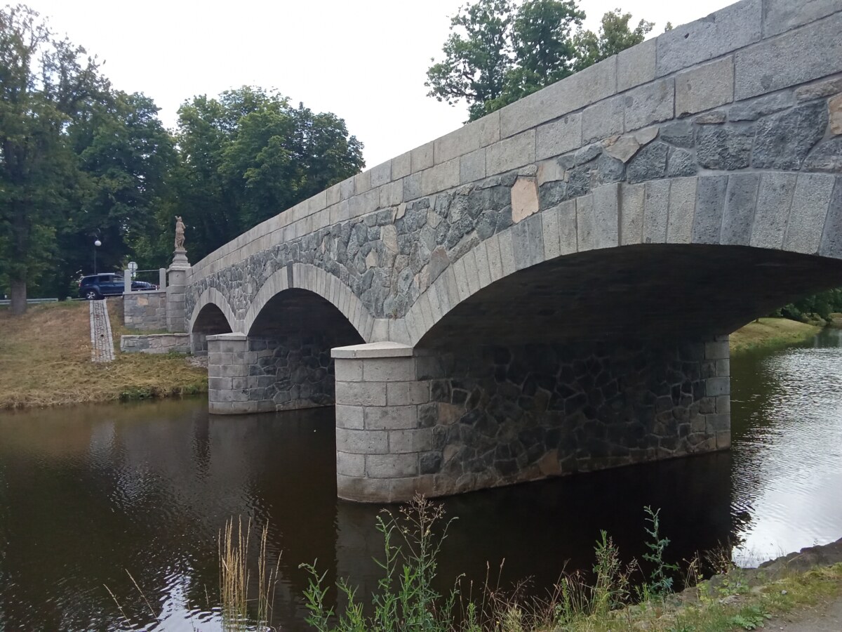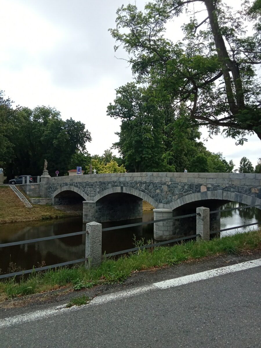 Nový kamenný most byl postaven na místo starého v roce 1899. Z původního mostu byly přeneseny čtyři sochy – tři barokní z dílny Ignáce Hammera z Dobré Vody: socha Panny Marie je z roku 1748, další dvě – sv. Dismas a Ukřižování z roku 1750. Socha sv. Jana Nepomuckého je z roku 1812. Všechny nesou ale letopočet 1901, kdy byly restaurovány. Březnický most patří mezi poslední kamenné mosty v Čechách, po té se užívalo železobetonu a je dílem rodáka Ing. J. Kodla.