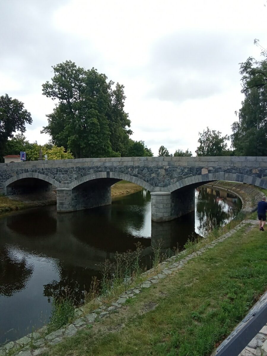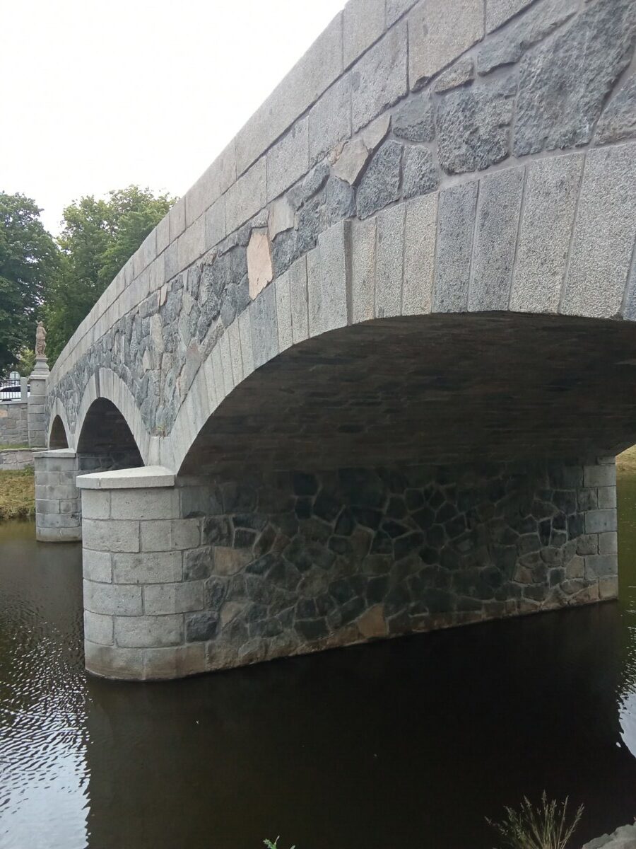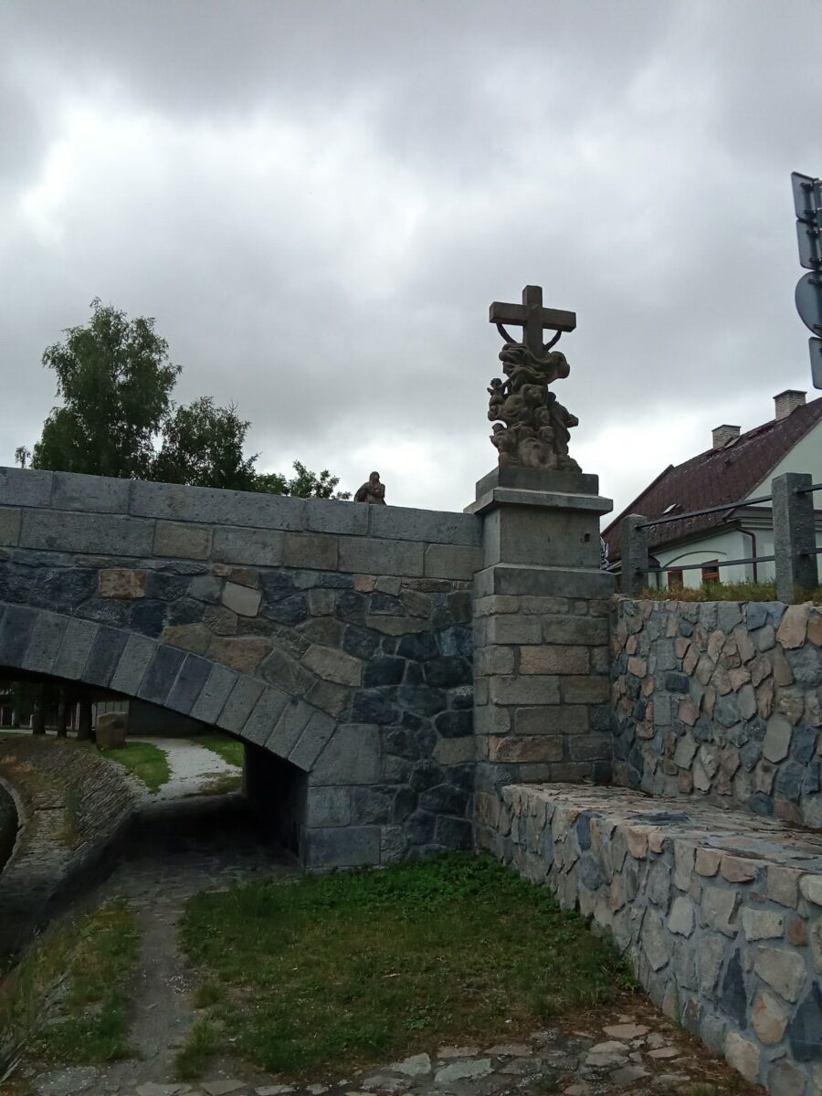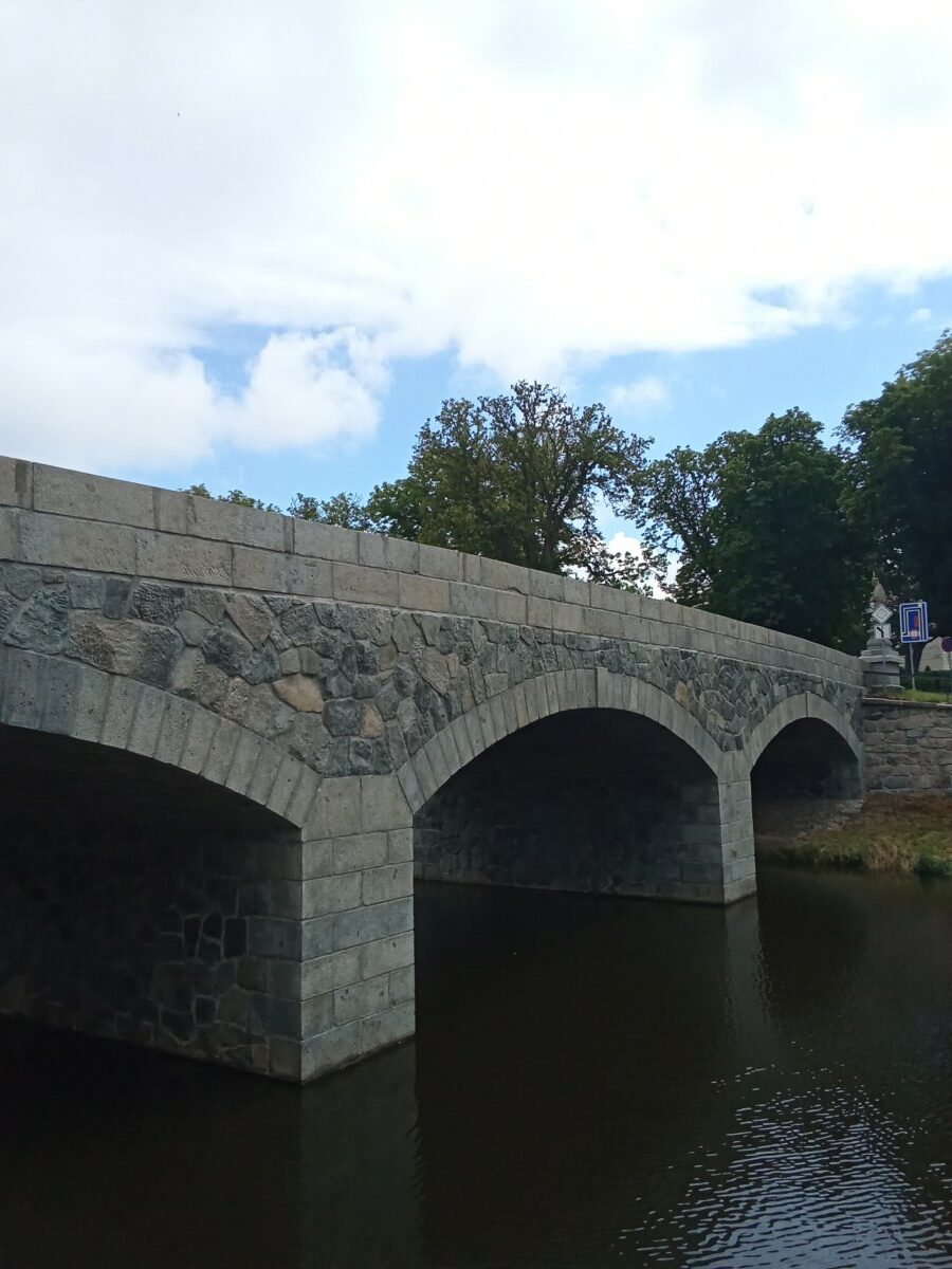Nový kamenný most byl postaven na místo starého v roce 1899. Z původního mostu byly přeneseny čtyři sochy – tři barokní z dílny Ignáce Hammera z Dobré Vody: socha Panny Marie je z roku 1748, další dvě – sv. Dismas a Ukřižování z roku 1750. Socha sv. Jana Nepomuckého je z roku 1812. Všechny nesou ale letopočet 1901, kdy byly restaurovány. Březnický most patří mezi poslední kamenné mosty v Čechách, po té se užívalo železobetonu a je dílem rodáka Ing. J. Kodla.