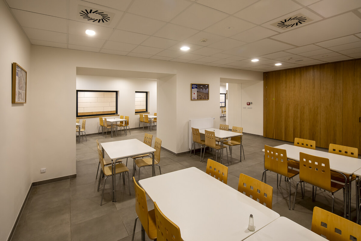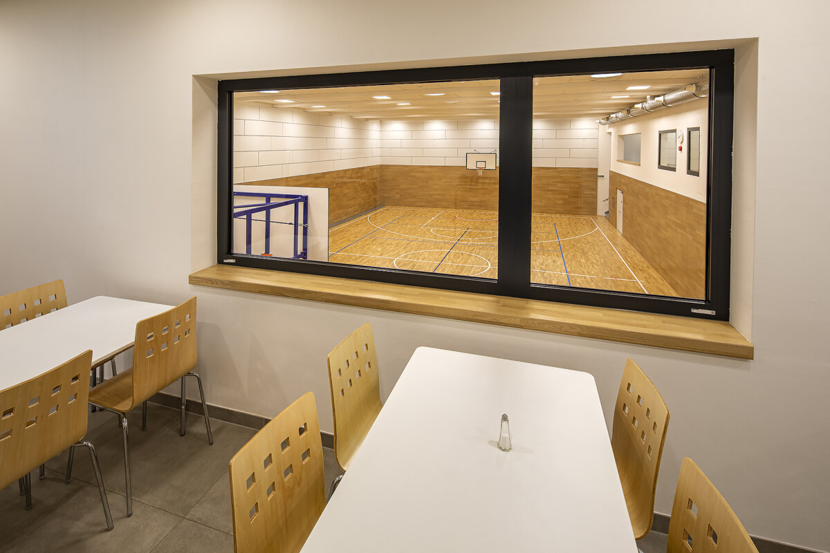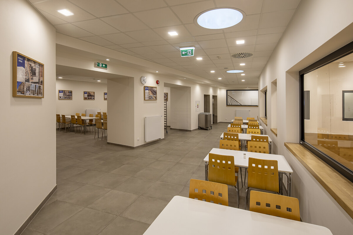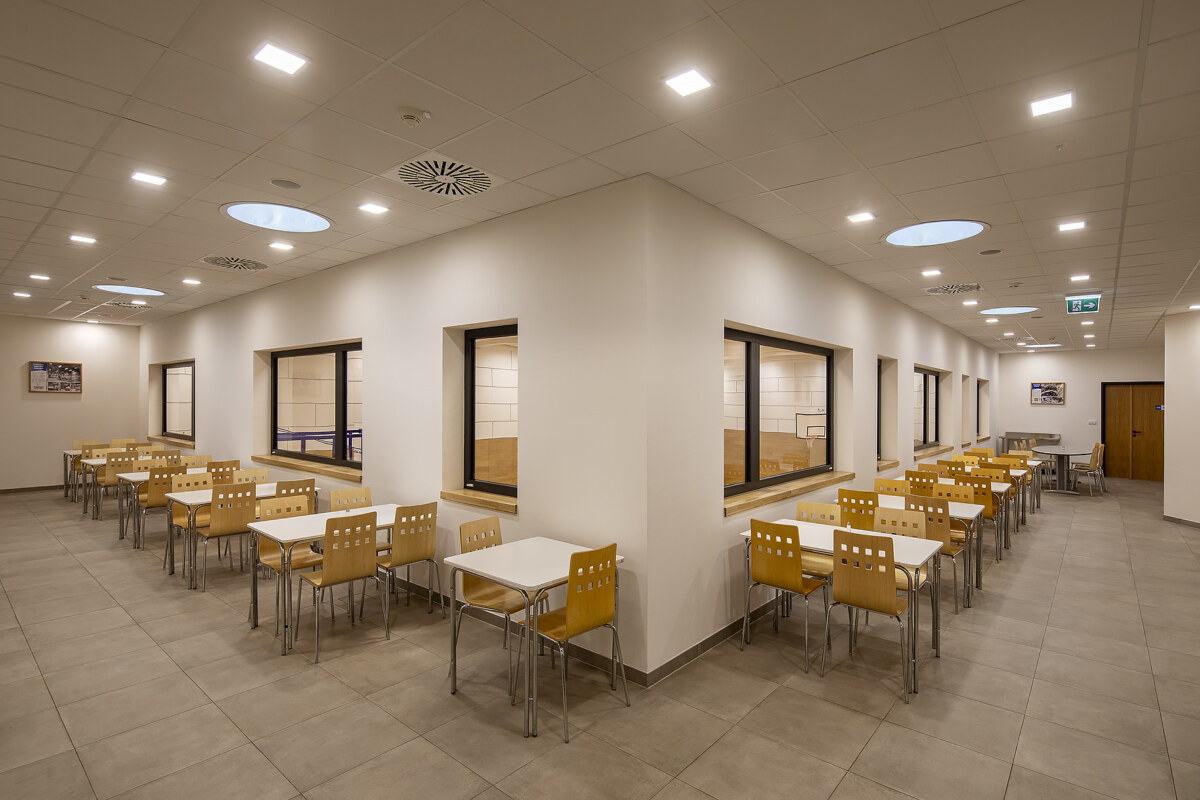 Součástí projektu byla rovněž kompletní přestavba stávajícího prostoru na moderní jídelnu s kapacitou až 200 strávníků. Nové zázemí pro výdej stravy je navrženo s důrazem na funkčnost a komfort provozu. K zajištění bezbariérového přístupu slouží nový výtah. Projekt znamená významné rozšíření funkčních prostor školy a zajišťuje kvalitní podmínky pro stravování a sportovní vyžití studentů i zaměstnanců.
