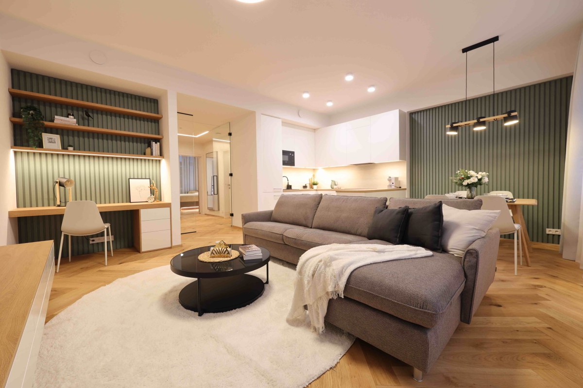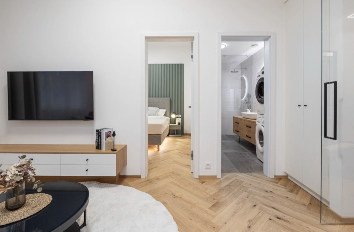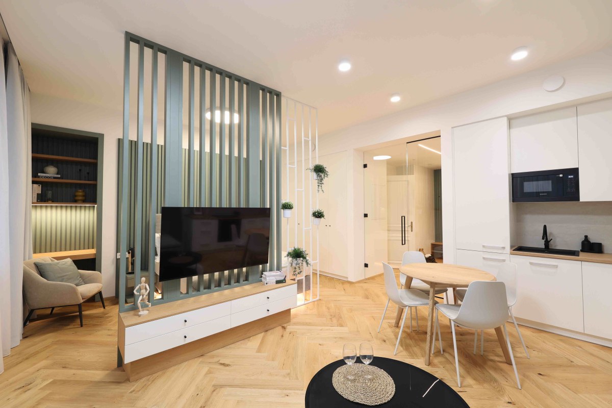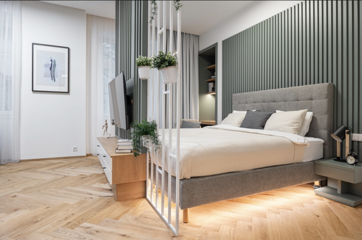 Vstupní dveře do bytů a zábradlí na hlavním schodišti jsou provedeny v zelené barvě. Ta se propisuje v bytových jednotkách v podobě nábytkových paravánů a lamelových obkladů stěn. Podlahy v bytech jsou dřevěné, kladené v parketovém vzoru. Celkově je design interiéru laděn v jemných světlých barvách v kombinaci s přírodním odstínem dřeva. Vzdušnost bytů dotváří skleněné dvoukřídlé interiérové dveře do hlavního obytného prostoru.