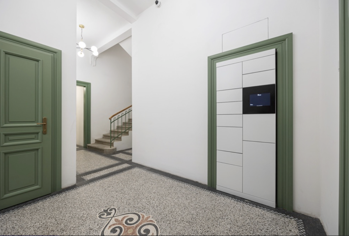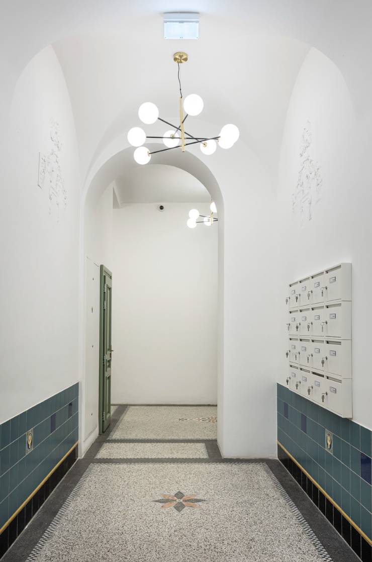 Základním prvkem interiéru společných prostor je zelená barva vyskytující se již historicky na vstupních dveřích do bytů, zábradlí a dalších prvcích. Nánosy času přinesly obměny a cílem projektu bylo navázat na historickou stopu, sjednotit a restaurovat prvky společných prostor. Světle zelená barva se tak stává propojujícím prvkem mezi dochovanou historickou částí společných prostor a moderním designem vnitřního prostoru bytů.